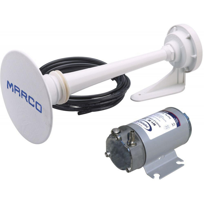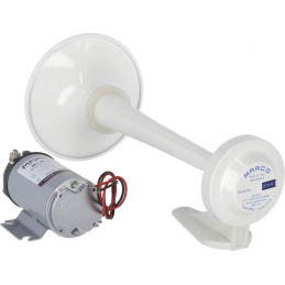 Avertisseur homologué pour bateaux de 20m à 75m. RINA ELE/35398/1 et LLOYD’S MSA9800032. Pavillon Ø300mm laiton peint vernissé blanc. Branchement sur air du bord 6 à 12 bars nécessaires. Livré avec accessoires et électrovanne.