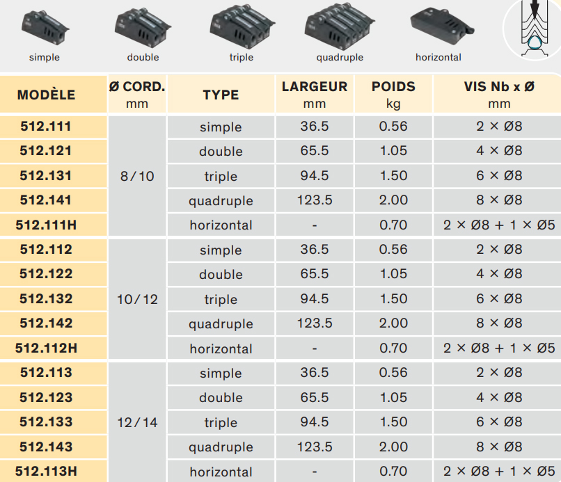 La nouvelle série de bloqueurs Antal pour des charges allant jusqu’à 1500 kg. Elle est équipée de la grande came en V: le système V-Grip Antal. Trois tailles pour cordages de 8-10, 10-12 et 12-14 mm en cinq versions: simple, double, triple, quadruple et en montage horizontal