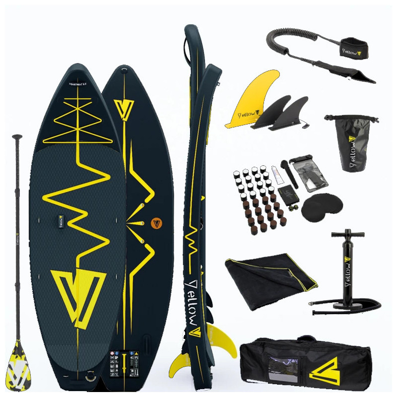 Lorsque vous achetez un support Yellow V, il est livré avec une pagaie double action, une pompe, un sac de transport, un kit de réparation, un jeu, une laisse, un étui étanche pour téléphone portable et une grande serviette Yellow V assortie