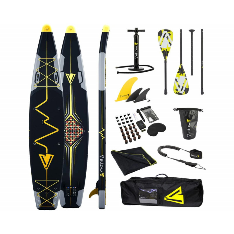 Inclus SUP, Plateforme, Pagaie double action, Pompe, Sac de transport, Kit de réparation, Set de jeu, Leash, Housse étanche pour téléphone portable, Serviette YellowV, Sac étanche 15 litres