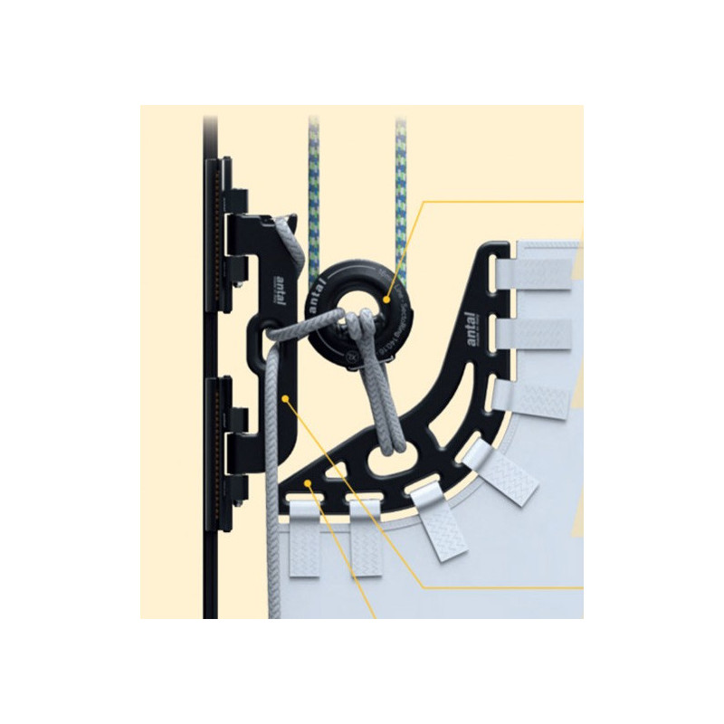 Une têtière sanglée au haut de la voile et reliée à un chariot de têtière (double) par un axe démontable assure une liaison sûre et simple de la voile à la drisse et au mât.