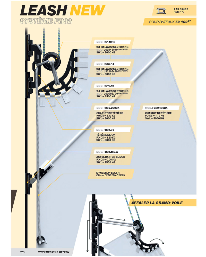 Chaque latte est reliée à un chariot de latte par un cardan avec un embout fileté qui permet la libre orientation de la latte. Cet embout vient se visser sur un boîtier pour latte ronde ou plate. Entre chaque latte, un chariot intermédiaire permet, à l’aide d’un sanglage, de maintenir le guindant.