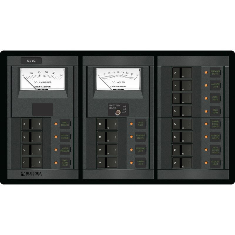 Tableau électrique Blue Sea 360 - 12V DC - 16 positions avec voltmètre/ampèremètre